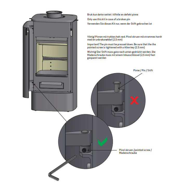 Det kan føre til, at hængslet løsner sig fra brændkammeret og glider ud af sin korrekte position, hvilket i værste fald kan føre til skader. Hvis denne skrue er løs på din brændeovn, skal du spænde den med en unbrakonøgle. Du får leveret en korrekt skrue fra Jøtul AS.