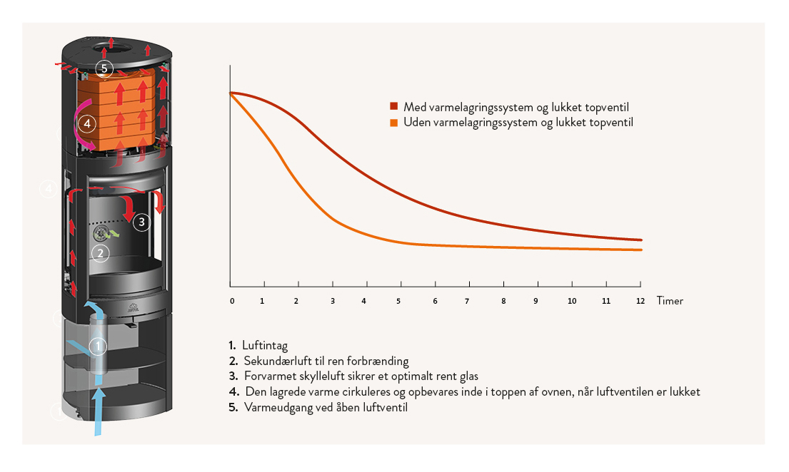 Flere af vores brændeovne har også mulighed for varmelagring i toppen, såsom Jøtul F 371 Advance High Top, det såkaldte Jøtul Heat Storage System. Takket være skjulte varmelagrende sten placeret i toppen af brændeovnen kan de afgive op til 12 timers ekstra varme, efter at du sidst har lagt brænde på. Fyr op i brændeovnen om morgenen og tag på arbejde, når du kommer hjem, varmer den stadig. Med Jøtul Heat Storage System forlænger du varmeperioden og får lavere brændeforbrug.